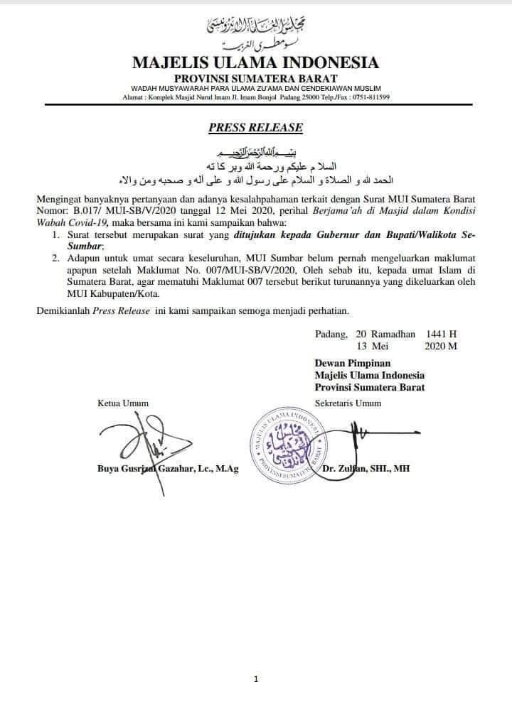 Melalui press relis tertanggal 13 Mei 2020. Rrlis itu berisikan dua point Yakni, petama surat tersebut ditujukan pada Gubernur Sumbar dan Bupati/Walikota se Sumbar. Kedua, adapun untuk secara keseluruhan MUI Sumbar belum pernah mengeluarkan maklumat apapun setelah maklumat 007/MUI-SB/V/2020. Oleh sebab itu kepada umat Islam di Sumbar agar mematuhi maklumat tersebut berikut turunannya yang dikeluarkan oleh MUI kabupaten/kota.