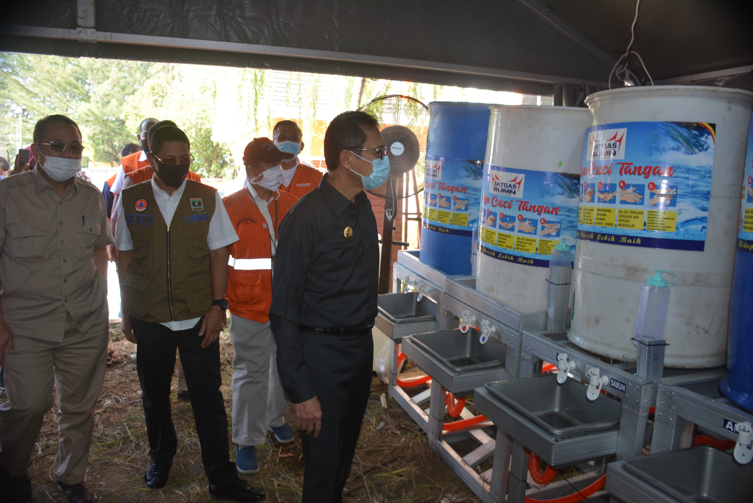 Gubernur Irwan Prayitno didampingi Kalaksa BPBD Sumbar, Erman Rahman dan Sekdaprov Sumbar melihatkan langsung westafel bantuan dari Satgas Bencana BUMN, Rabu (10/6/2020).ist