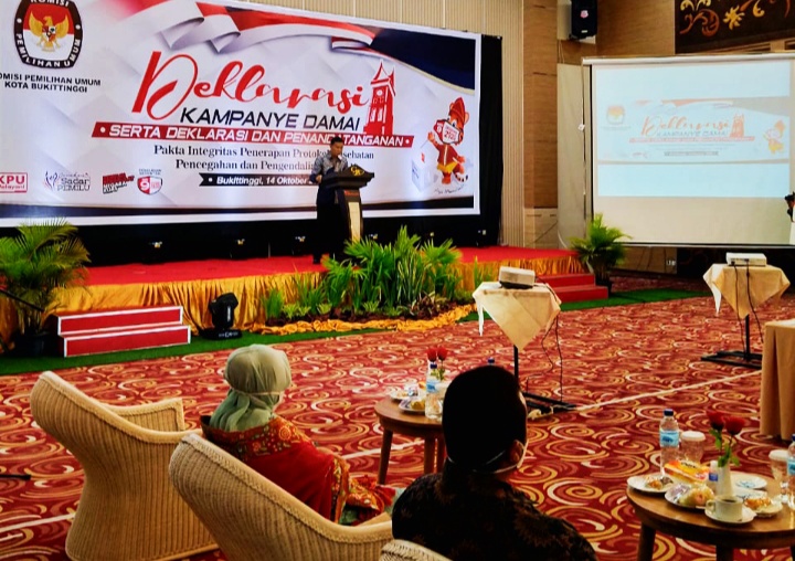 BUKITTINGGI — Komisi Pemilihan Umum (KPU) Kota Bukittinggi menggelar “Deklarasi Kampanye Damai serta Deklarasi dan Penandatanganan Pakta Intergritas Penerapan Protokol Kesehatan Pencegahan dan Penanganan Covid 19”, Rabu (14/10/2020).