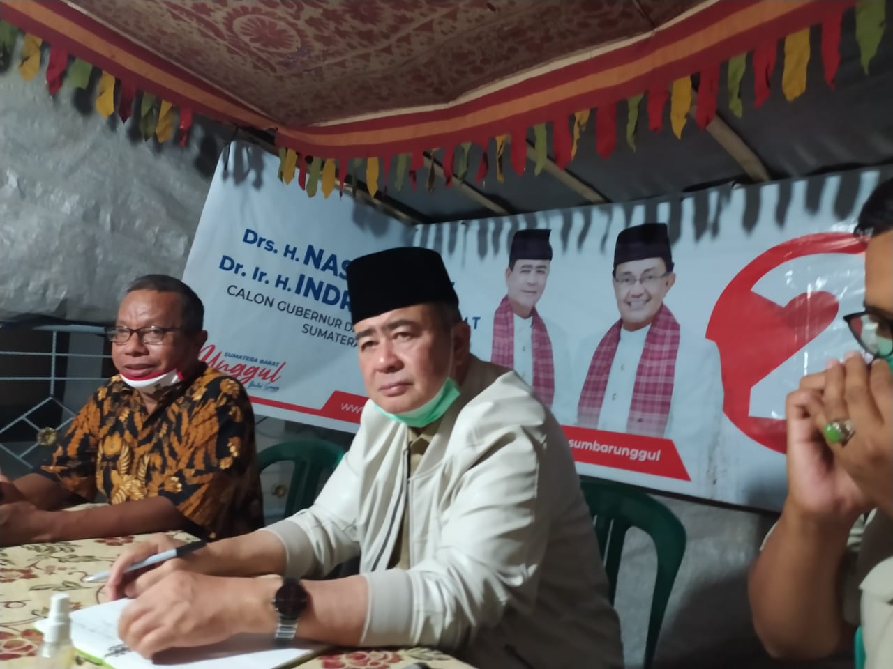 PESISIR SELATAN—Setelah debat Pilkada Sumbar tahap kedua, Nasrul Abit langsung menuju Lubuk Nyiur, Kecamatan Batang Kapas, Pesisir Selatan, Rabu (3/12). Saat berdialog dengan warga Batang Kapas, ia menjelaskan tentang isu-isu yang dibahas dalam debat, salah satunya tentang persoalan mangrove di kawasan Mandeh dan pembangunan rumah sakit di Painan.