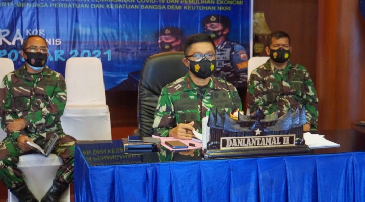 PADANG – Komandan Pangkalan Utama TNI AL (Danlantamal) II Laksamana Pertama TNI Hargianto.SE.,MM.,M.Si (Han) didampingi Asisten Pembinaan Potensi Maritim (Aspotmar) Kolonel Laut (P) Yusherman dan Kadispotmar Letkol Laut (PM) Rachmad Gunawan dalam rangka Rapat Kordinasi dan Rapat Teknis, Kamis (25/2/2021).