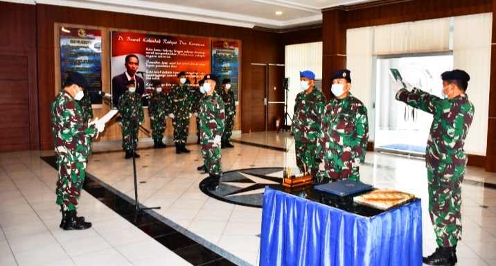 PADANG – Komandan Pangkalan Utama TNI AL Danlantamal II Laksamana Pertama TNI Hargianto.SE.MM.MSi (Han), sebagai inspektur upacara pada serah terima jabatan Dantim Intel dan Kadispotmar Lantamal II Padang, Senin (12/4/2021).