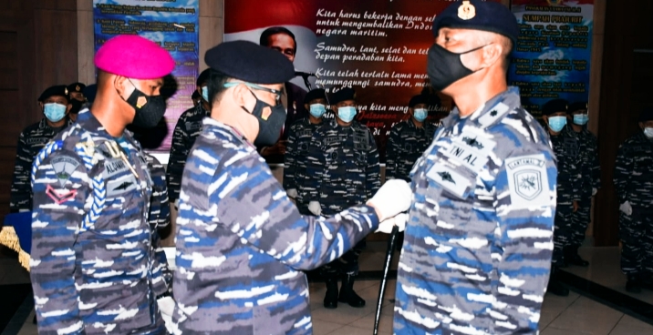 PADANG – Komandan Pangkalan Utama TNI AL (Danlantamal) II Padang Laksamana Pertama TNI, Hargianto.SE.,MM.,MSi (Han), sebagai Inspektur Upacara pada acara pengukuhan Jabatan Asisten Intelijen Danlantamal di Lobby Markas Komando (Mako) Lantamal II jalan Bukit Peti Peti Teluk Bayur Padang, Senin (9/8/2021).