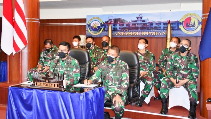 PADANG-Sehari setelah serah terima jabatan (Sertijab), Panglima Komando Armada I (Pangkoarmada I) menggelar entry briefing, Selasa (10/8/2021). Pangarmada I, Laksamana Muda TNI Arsyad Abdullah, SE. MAP, merupakan alumni AAL angkatan 36 tahun 1990 sebelumnya menjabat sebagai Panglima Komando Lintas Laut Militer (Pangkolinlamil). Entry Briefing dilaksanakan secara daring menggunakan aplikasi Zoom metting. Danlantamal II, Laksamana Pertama TNI Hargianto, SE., MM., MSi (Han) mengikuti zoom metting dari ruang transit VIP Mako Lantamal II.