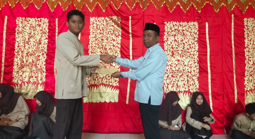PADANG – Kepala Madrasah Tsanawiyah Negeri (MTsN) 1 Padang Isrizal serahkan reward kepada Anazra Romes Debarza siswa kelas IX.5 peraih Juara Harapan 3 Kompetisi Sains Madrasah (KSM) Bidang Studi IPS terpadu terintegrasi) tingkat Kota Padang 2022, di aula seranguna madradah, Jumat, (19/8/22).
