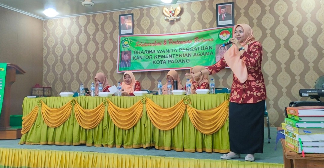 PADANG – Ketua Dharma Wanita Persatuan (DWP) Madrasah Tsanawiyah Negeri (MTsN) 1 Kota Padang Ny. Nova Sillia Isrizal jadi Narasumber pada acara Silaturrahmi dan Pertemuan Bulanan DWP Kementerian Agama Kota Padang di aula lantai 2 Kemenag Padang, Jumat (16/9/22).