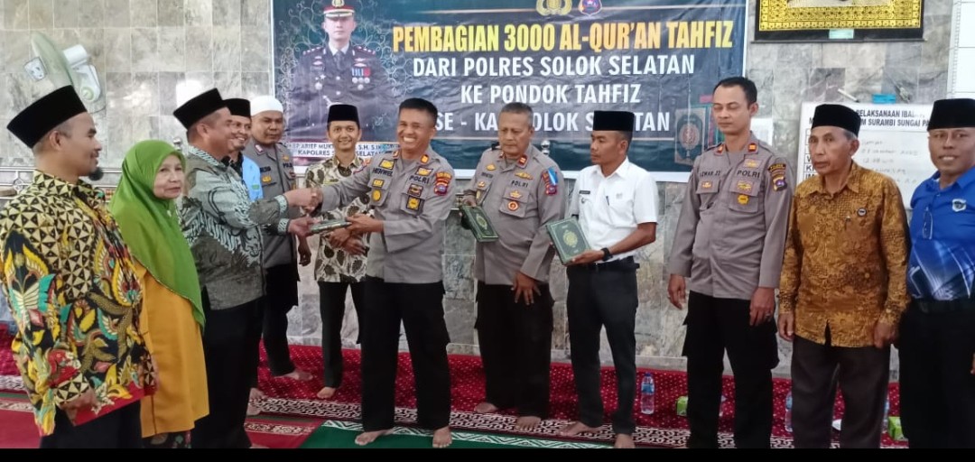 SOLOK SELATAN –– Polres Solok Selatan (Solsel) menyerahan 3.000 Al Qur’an Tahfiz ke Seluruh Pondok Tahfiz ke Badan Komunikasi Pemuda Remaja Mesjid Indonesia (BKPRMI) dan ke Forum Rumah Tahfiz Solsel, untuk diserahkan ke seluruh rumah Tahfiz di Kabupaten Nagari Saribu Rumah Gadang ini.