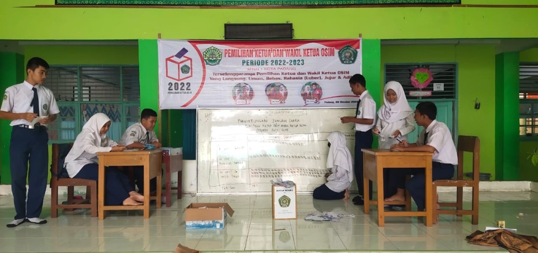 PADANG – Semua proses Pemilihan Umum ketua dan wakil ketua Organisasi Siswa Intra Madrasah (OSIM) MTsN 1 Kota Padang telah usai. Pasangan calon nomor urut 3 Hafiz-Viona menang telak atas paslon 1 Azzahra-Kheisya, dan paslon nomor urut 2 Mailizar-Namira.