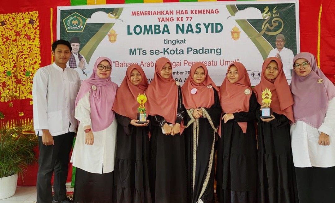 PADANG – Sukses meraih juara 3 lomba nasyid bahasa Arab dan harapan 2 pidato bahasa Arab, Kelompok Kerja Guru (KKG) Bahasa Arab naikkan jumlah poin juara Madrasah Tsanawiyah Negeri (MTsN) 1 Kota Padang dari 78 menjadi 79 dan dari 23 prestasi naik menjadi 25 prestasi.