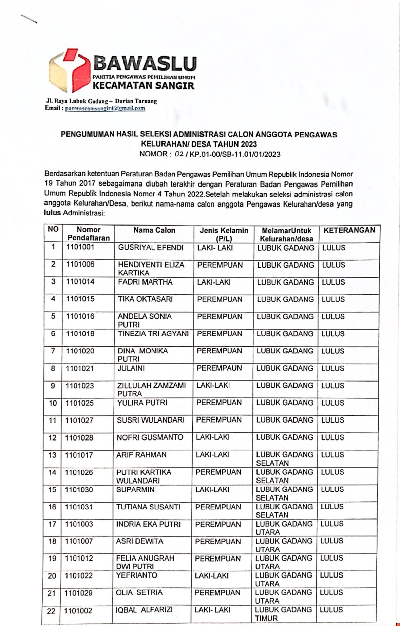 SOLSEL – Panitia Pengawas Kecamatan (Panwascam) Sangir mengumumkan hasil seleksi administrasi calon anggota pengawas pemilihan kelurahan/ desa untuk daerah kerja masing masing.