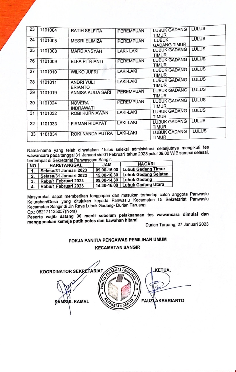 Untuk masing masing nagari, jumlah calon anggota panitia pengawas yang lulus bervariasi. Bagi mereka yang telah lulus administrasi akan dilakukan selanjutnya tes wawancara.