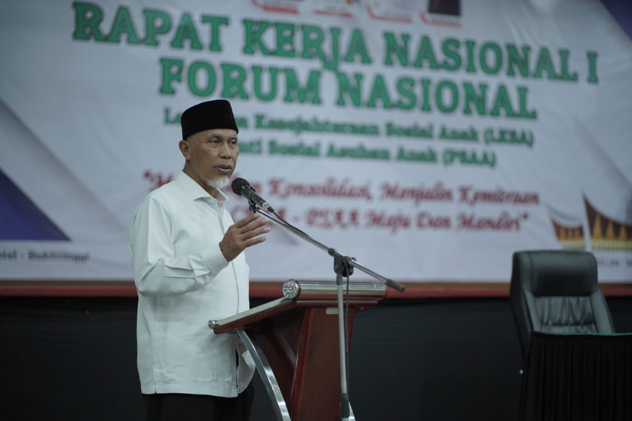 PADANG – Gubernur Sumatera Barat (Sumbar), Mahyeldi membuka Rapat Kerja Nasional (Rakernas) ke I Tahun 2023 Panti Sosial Asuhan Anak/Lembaga Kesejahteraan Sosial Asuhan Anak (PSAA/ LKSA) di Bukittinggi, Sabtu (22/07/2023).