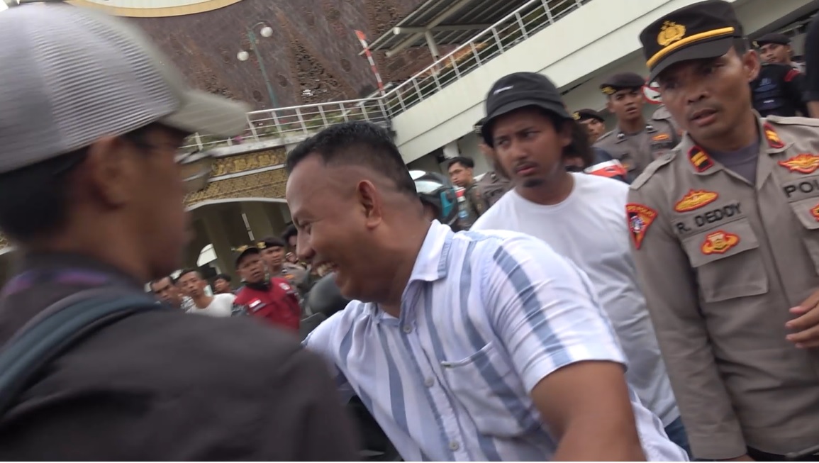 Tiba-tiba ada salah satu pihak dari kepolisian menghalangi kamera Dasril untuk merekam. “Sudah-sudah jangan direkam lagi,” kata salah seorang polisi kepada Dasril. Mendapatkan perlakuan tersebut, Dasril tetap melanjutkan.
