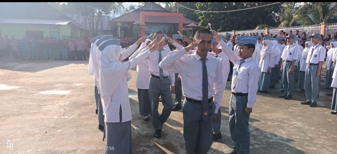 PADANG – Keheningan terpecah dengan keharuan disaat apel pagi digelar dengan kegiatan sakral pena pora siswa takhassus MAN 3 Kota Padang oleh kepala madrasah Afrizal di lapangan upacara, Rabu (9/8/2023).