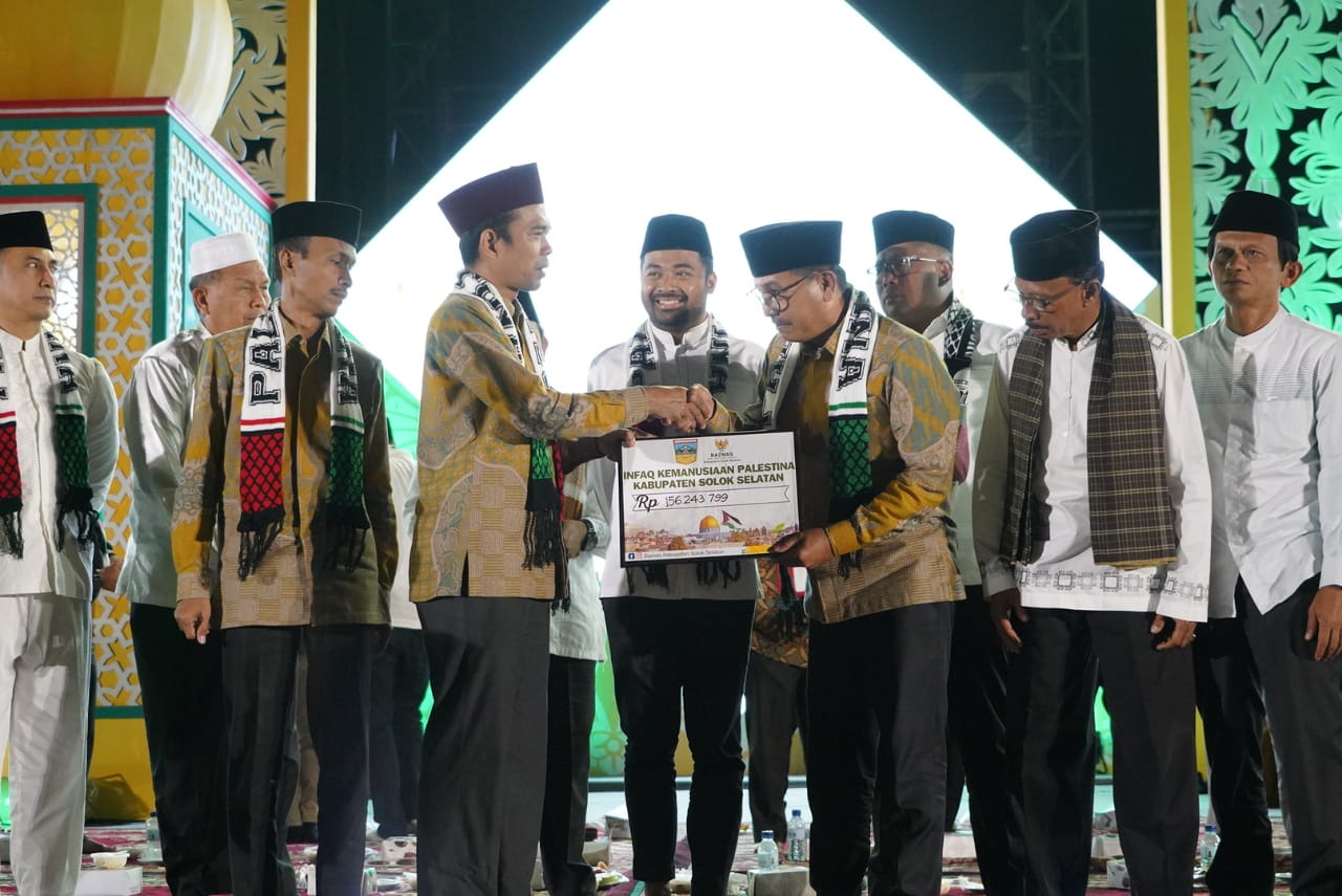 Pada kesempatan Tabligh Akbar di GOR Rimbo Tangah, Pemkab Solok Selatan melalui Baznas setempat memberikan bantuan untuk Palestina senilai Rp 156.243.799. Selain itu juga diserahkan bantuan tujuh unit motor untuk KUA di Solok Selatan. (Adv)