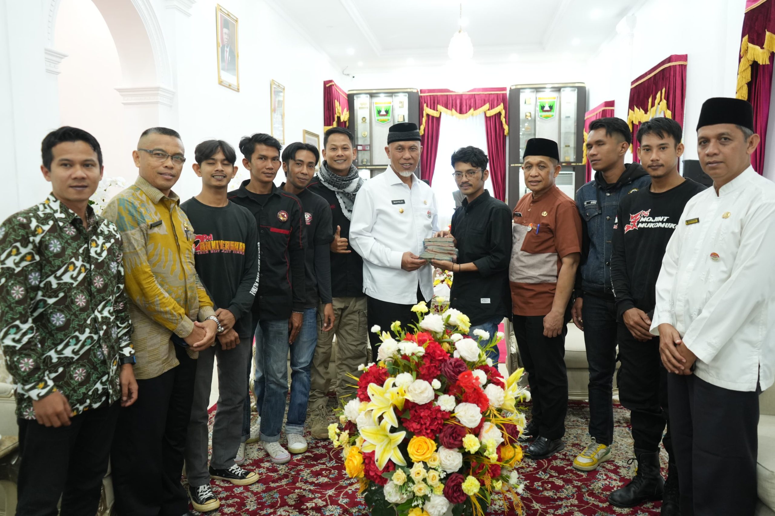 Gubernur Mahyeldi menerima Pemuda Lengayang Pesisisr Selatan yang berhasil mengumpulkan donasi Rp61 juta untuk Palestina di Istana Gubernuran Sumbar, Jumat (29/12/2023).Ist