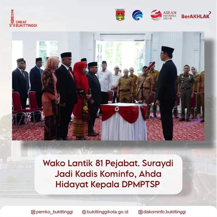BUKITTINGGI — Wali Kota Bukittinggi Erman Safar, lantik 81 pejabat di lingkungan Pemerintah Kota Bukittinggi, termasuk dua pejabat eselon dua, dilantik di Balairung rumah dinas wako, Selasa (2/1/2024).