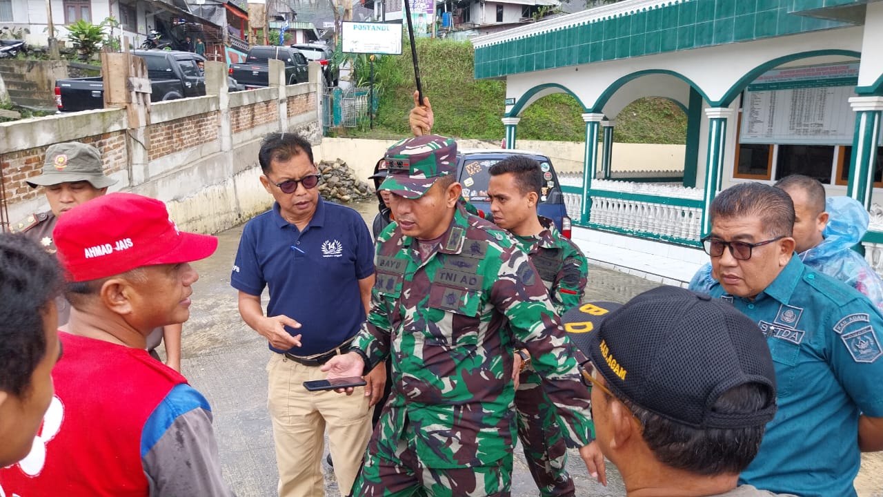 Dandim 0304 Wirabraja Letkol Bayu Ardithya Nugroho, saat berkoordinasi di lapangan terkait pendirian posko bagi warga yang tinggal radius 4 KM dari puncak Marapi. Dok Ktapunya