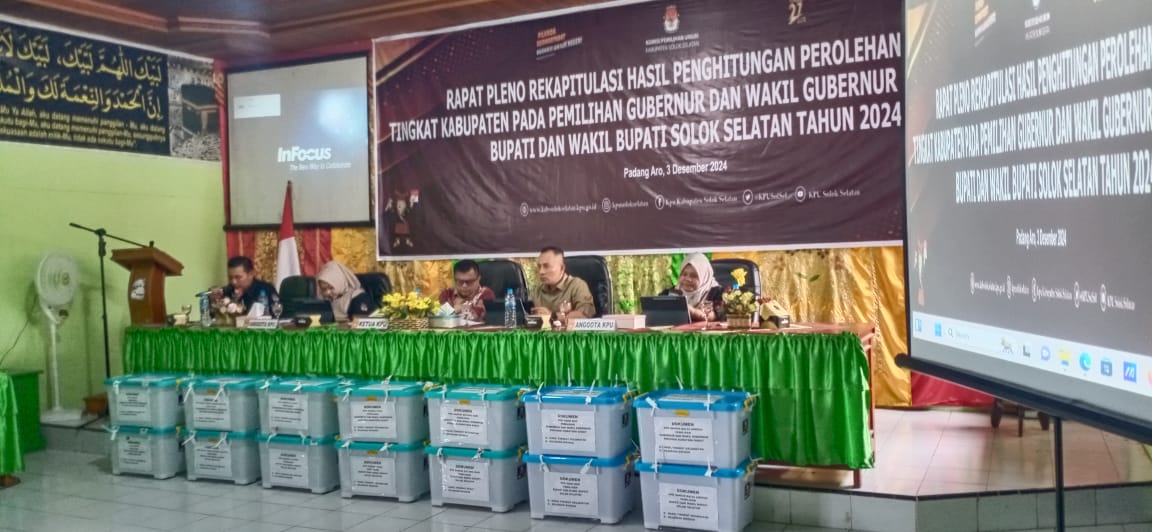 SOLOK SELATAN – Komisi Pemilihan Umum (KPU) Kabupaten Solok Selatan melaksanakan Rapat Pleno Rekapitulasi hasil Pemilihan Kepala Daerah (Pilkada) Pemilihan Gubernur Sumbar dan Wakil Gubernur Sumatera Barat dan Bupati Solok Selatan dan Wakil Bupati Solok Selatan tahun 2024 yang dilaksanakan di aula Kemenag Solsel, Selasa (3/12/2024).