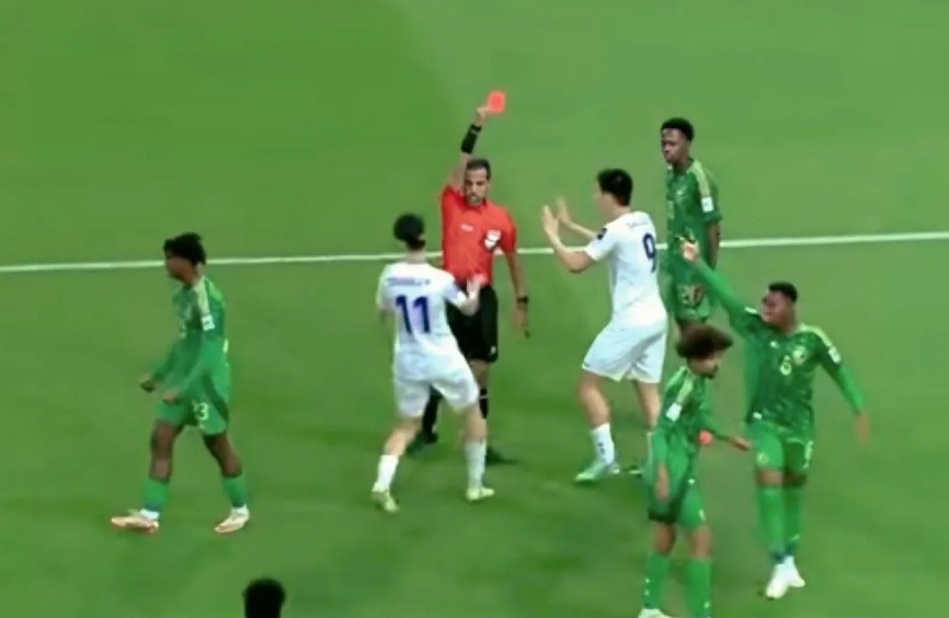 Tangkapan layar - Pemain Timnas Uzbekistan U-17 bernomor punggung 9, Nurbek Sansernbaev, mendapatkan kartu merah usai menendang pemain bertahan Arab Saudi U-17 Adel Hibah, dalam pertandingan final Piala Asia U-17 Arab Saudi 2025, di Stadion King Fahd Sports City, Taif, Minggu malam WIB.