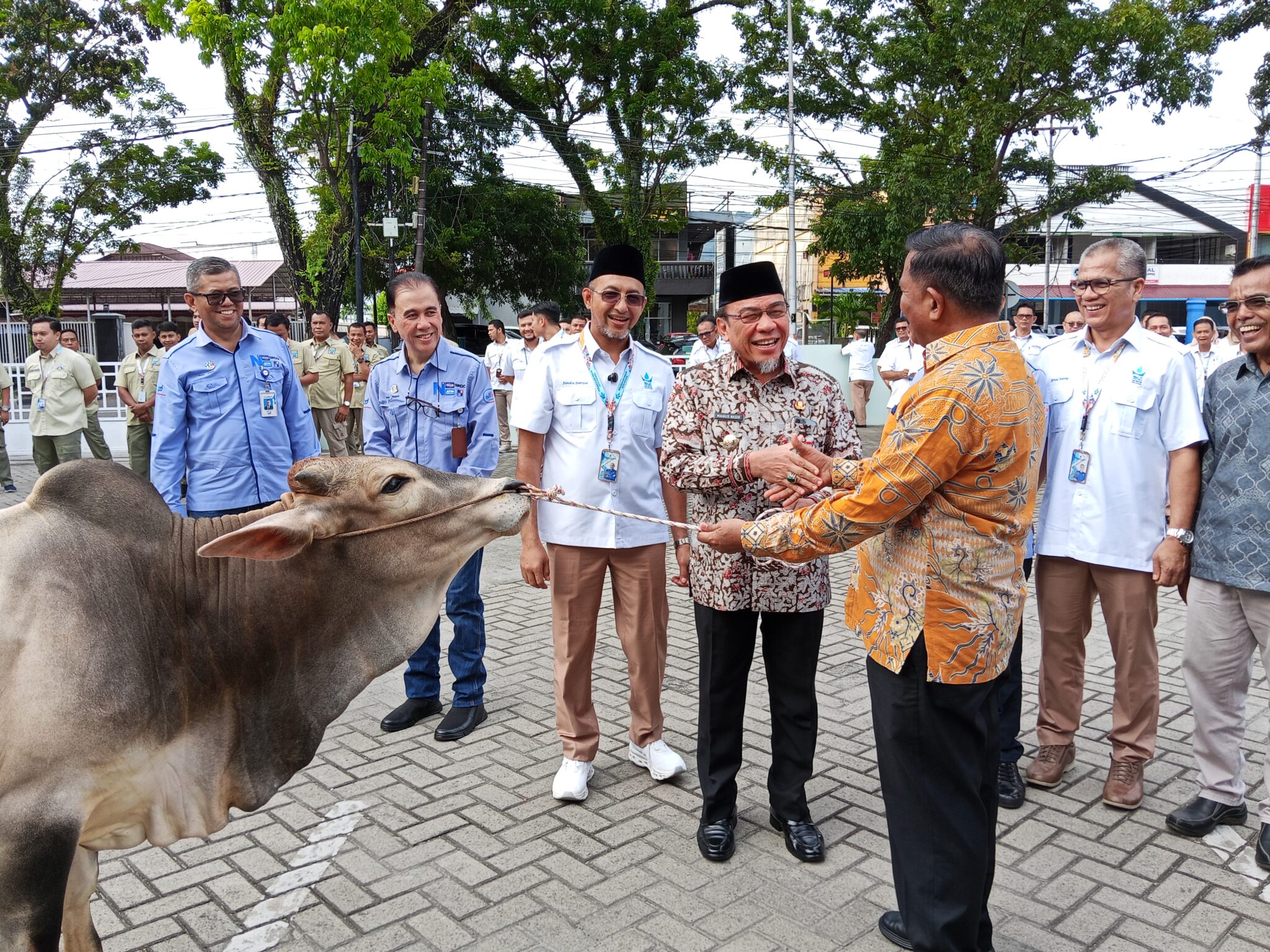 Bank Nagari juga menyerahkan satu ekor sapi kurban dan memberangkatkan dua pelanggan umrah pada HUT Perumda AM Padang tahun lalu.