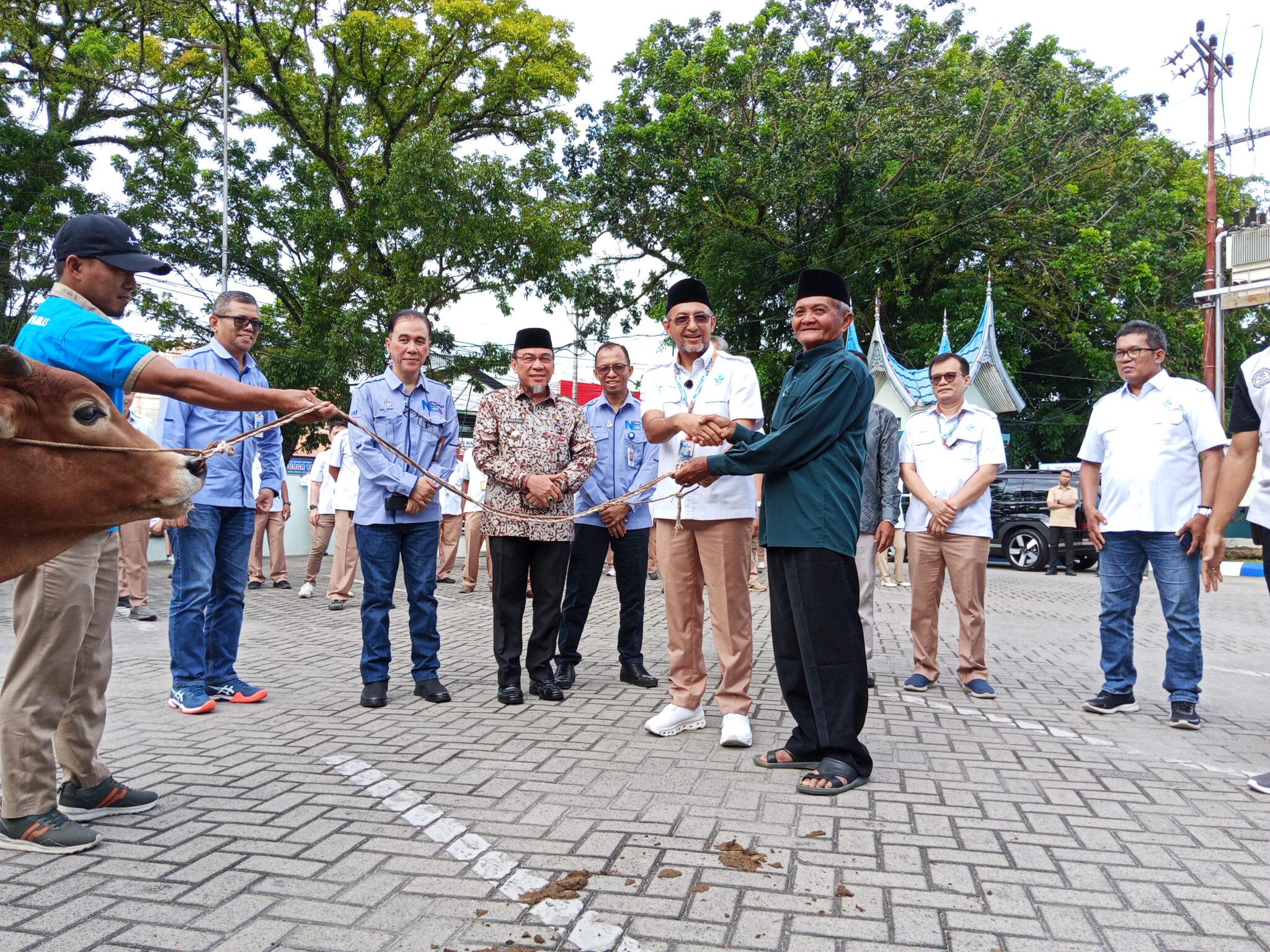 Wakil Wali Kota Padang Maigus Nasir menyerahkan hewan kurban secara simbolis di halaman parkir Perumda AM Padang, Rabu (14/5/2025).