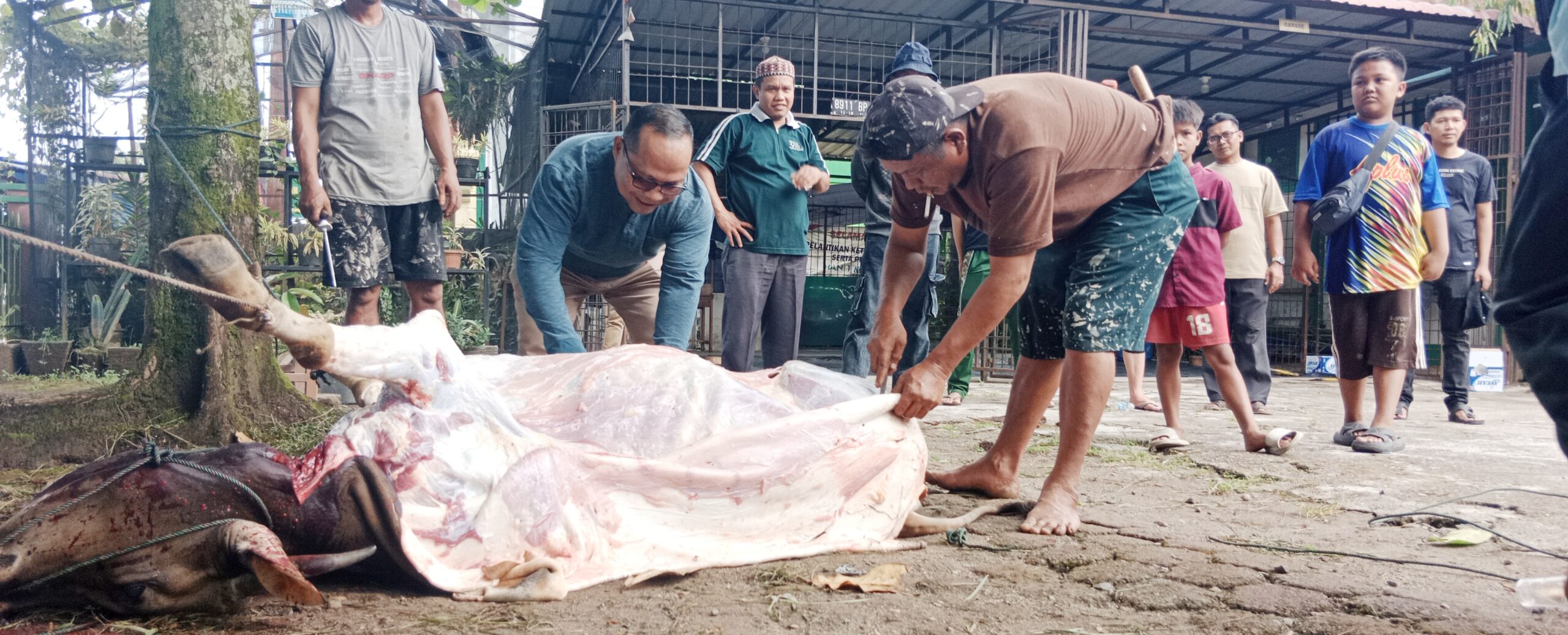 PADANG-Halaman madrasah MAN 1 Padang berdarah darah menyusul didabihnya (sembelih-red) dua ekor sapi kurban Idul Adha 1446 H 2025 masehi, Senin (9/6/2025). Bahkan, kurban madrasah di bilangan Jalan Durian Taruang ini kebetulan penyembelihnya Kepala Kemenag Dharmasraya Masdan SAg.