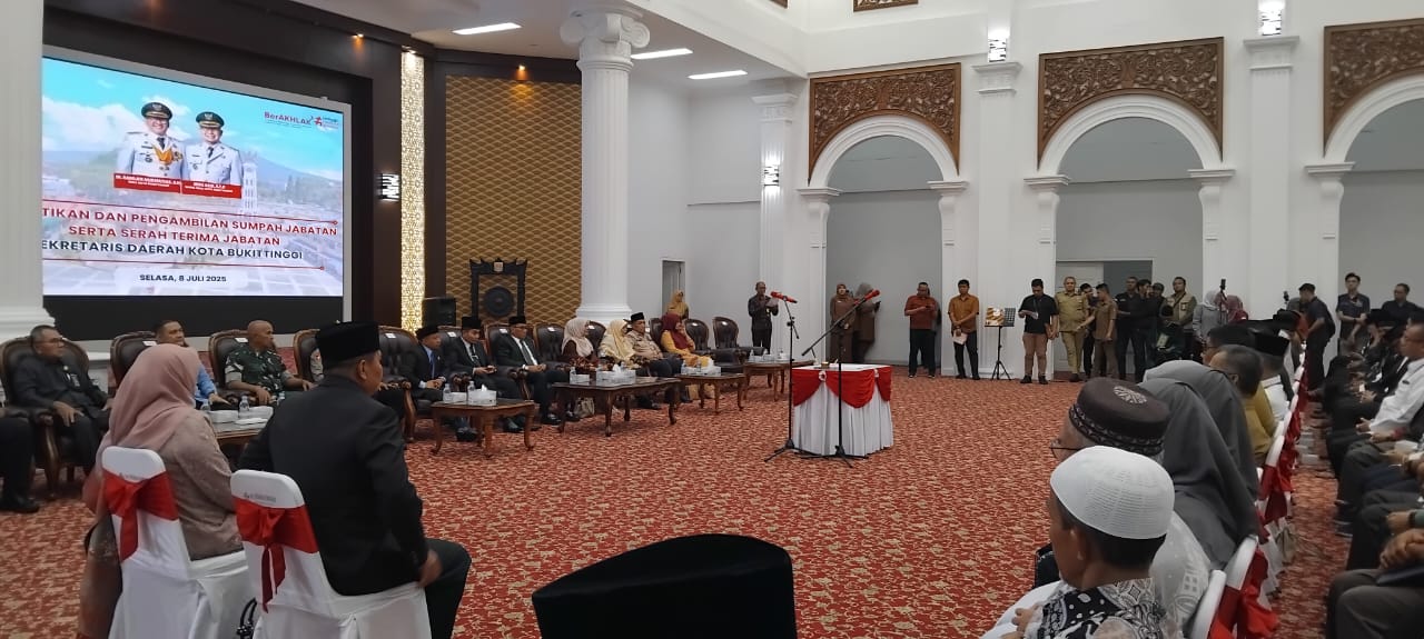 Pelantikan Rismal Hadi oleh Wali Kota Bukittinggi Ramlan Nurmatias bertempat di aula rumah dinas wali kota Belakang Balok, Selasa (8/7/2025), disaksikan sejumlah pimpinan Organisasi Perangkat Daerah (OPD) setempat.