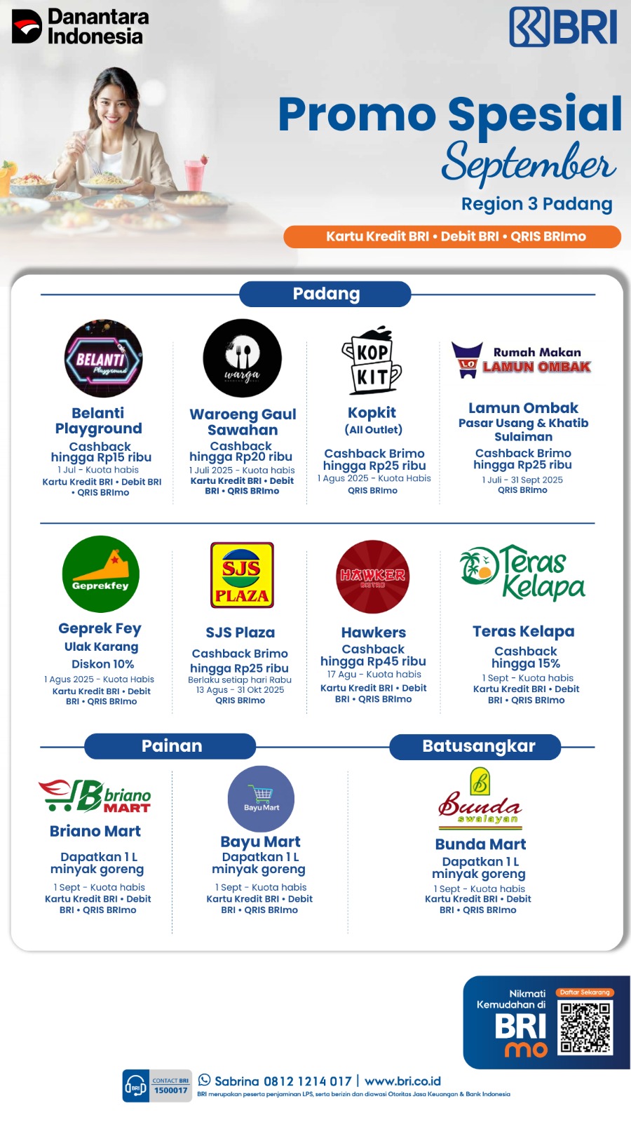 PADANG – BRI Region 3 Padang menghadirkan promo spesial sepanjang September 2025. Program berlaku di berbagai merchant pilihan di Sumatera Barat. Nasabah dapat menikmati cashback dan diskon dengan transaksi menggunakan Kartu Kredit BRI, Debit BRI, atau QRIS BRImo.