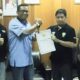Gubernur Mahyeldi menyerahkan penghargaan kepada Handezka Vaktonias atas raihan medali perunggu pada Kejuaraan Dunia Sambo Remaja dan Junior 2025 yang diserahkan melalui Bank Nagari. (bdr)
