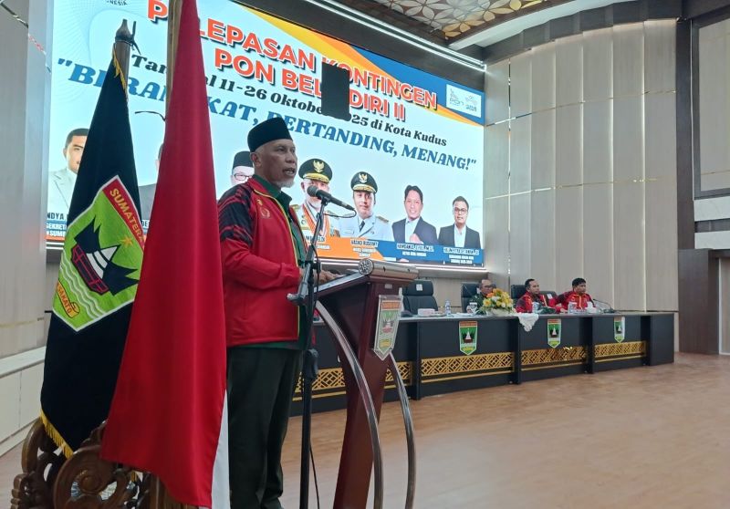 PADANG – Gubernur Sumatera Barat Mahyeldi melepas 124 atlet kontingen PON Beladiri II Sumbar menuju Kudus, Jawa Tengah, Kamis (9/10/2025). Pelepasan berlangsung di Aula Kantor Gubernur Sumbar dan dihadiri pimpinan DPRD, Forkopimda, Wakil Bupati Solok, Kepala Dinas Pemuda dan Olahraga, Direktur Utama Bank Nagari, Ketua KONI Sumbar, pelatih, dan official.