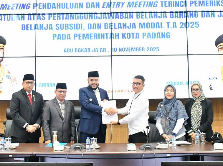 PADANG – Pemerintah Kota Padang bersama Badan Pemeriksa Keuangan Republik Indonesia (BPK RI) Perwakilan Sumatera Barat melaksanakan Exit Meeting Pendahuluan dan Entry Meeting Pemeriksaan Terinci Kepatuhan atas Pertanggungjawaban Belanja Barang dan Jasa, Belanja Subsidi, serta Belanja Modal Tahun Anggaran 2025.