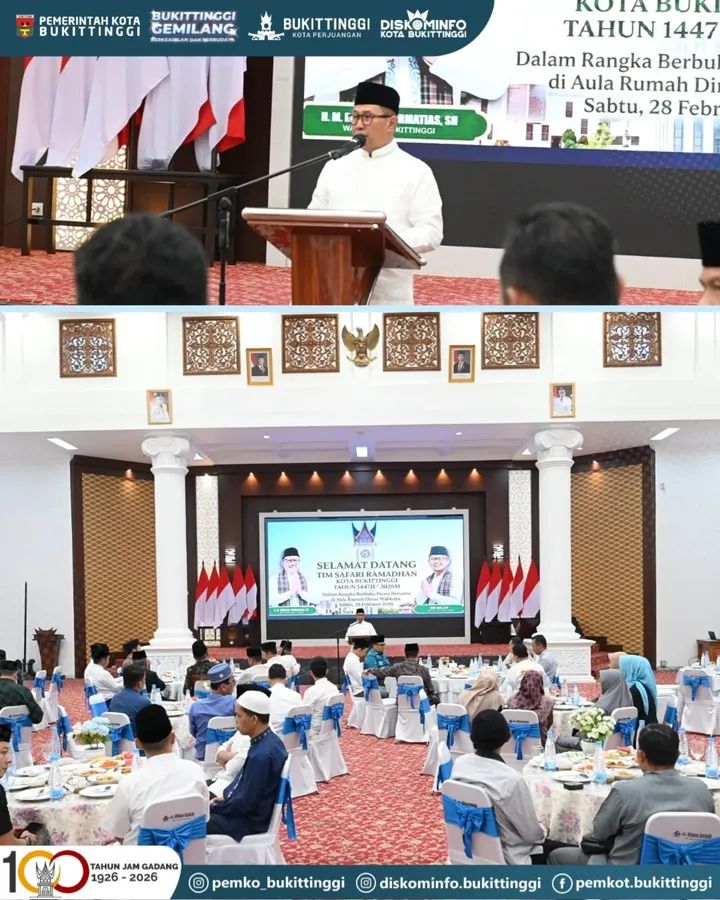 BUKITTINGGI – Pemerintah Kota Bukittinggi memulai rangkaian Tim Safari Ramadhan (TSR) 1447 Hijriah/2026 M. TSR dilepas Wali Kota Bukittinggi dalam rangkaian buka bersama di Balairung Rumah Dinas Wali Kota Bukittinggi, Sabtu (28/02/2026).